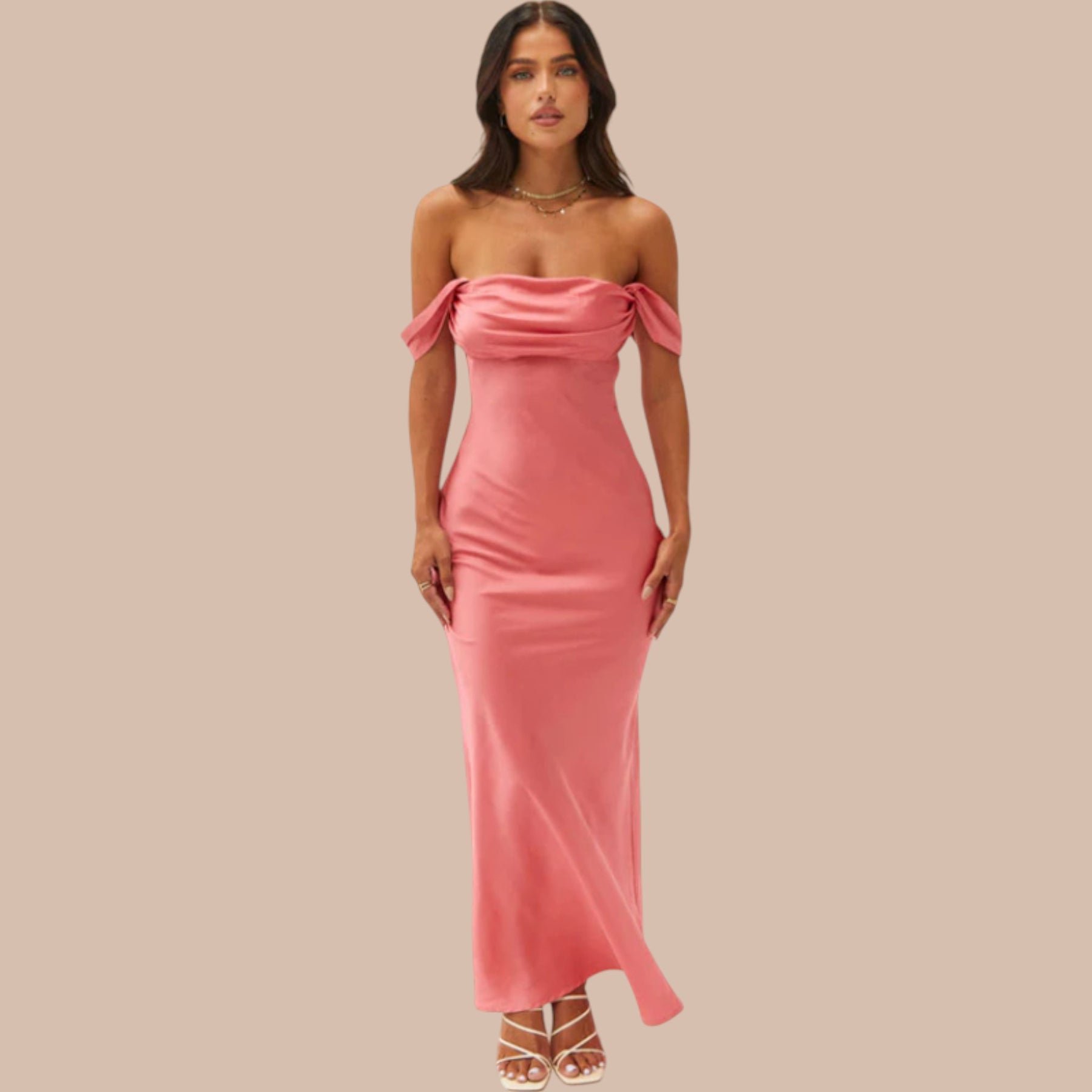 Elegância renascentista em cetim premium artístico. Design off-shoulder que combina tradição e modernidade.