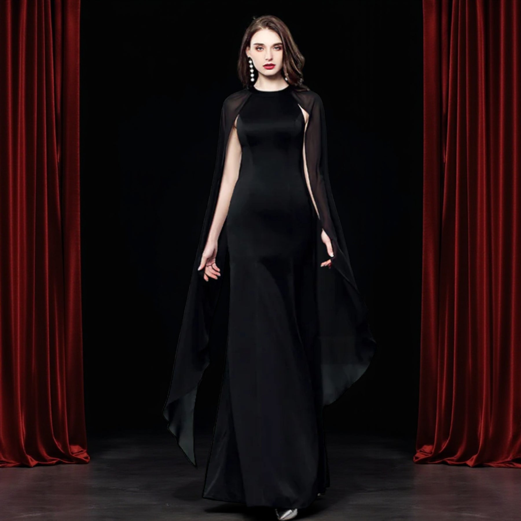 Elegância preciosa em poliéster premium dourado. Design longo que combina tradição e modernidade.