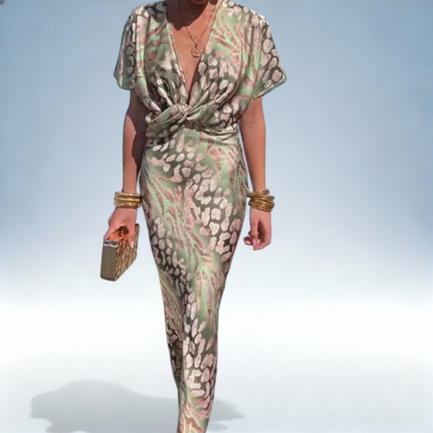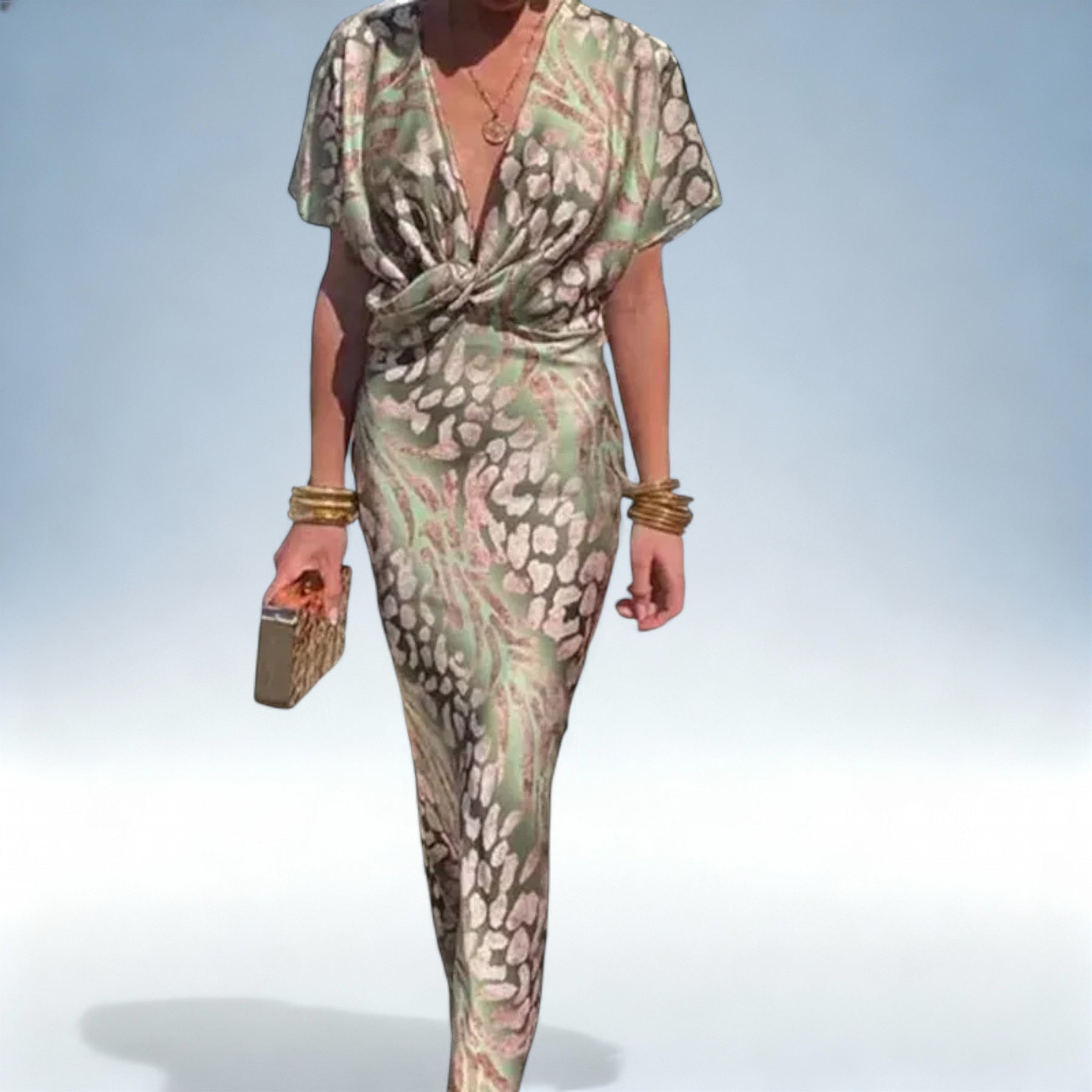 Leve e confortável, este vestido em cetim de poliéster premium destaca-se pelo design V-neck favorecedor e estampado vibrante, perfeito para ocasiões casuais, eventos formais ou para adicionar um toque chic ao teu dia a dia.