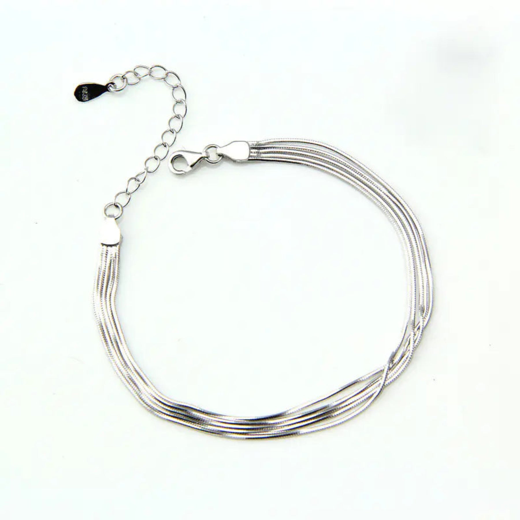 Eleva o teu estilo com a nossa requintada Pulseira de Prata Multicamadas. Desenhada com simplicidade em mente, esta pulseira deslumbrante apresenta uma única corrente serpente de cinco camadas que adiciona um toque de elegância a qualquer visual. Fabricada em prata de alta qualidade, não é apenas uma peça de joalharia - é uma expressão do teu gosto refinado.