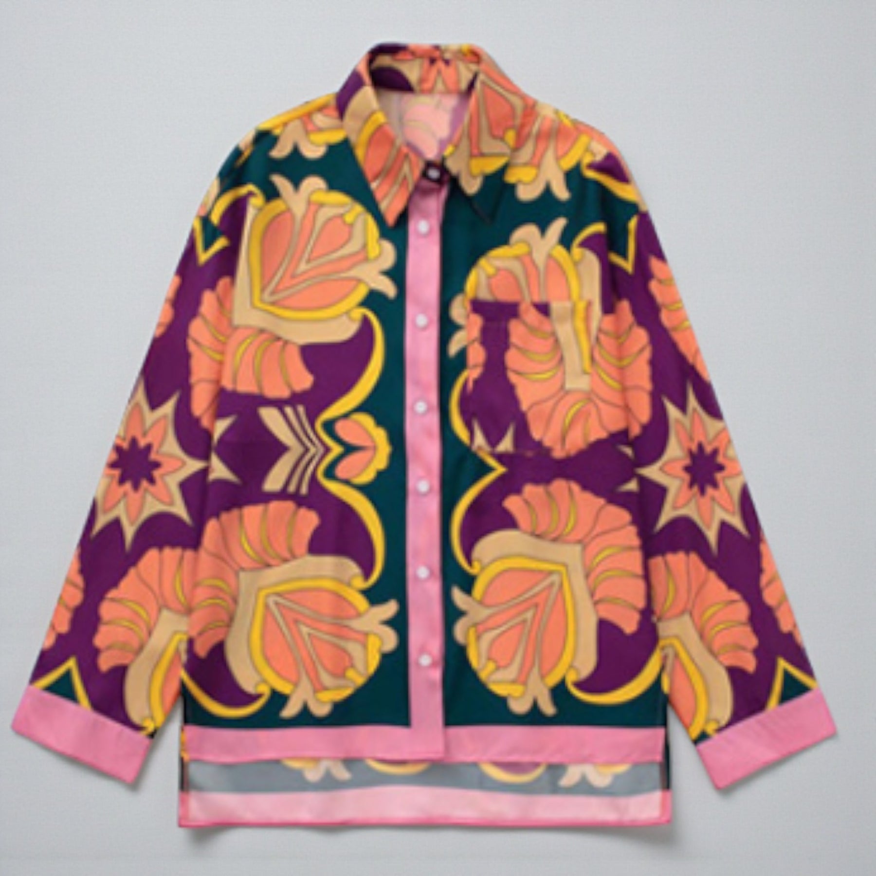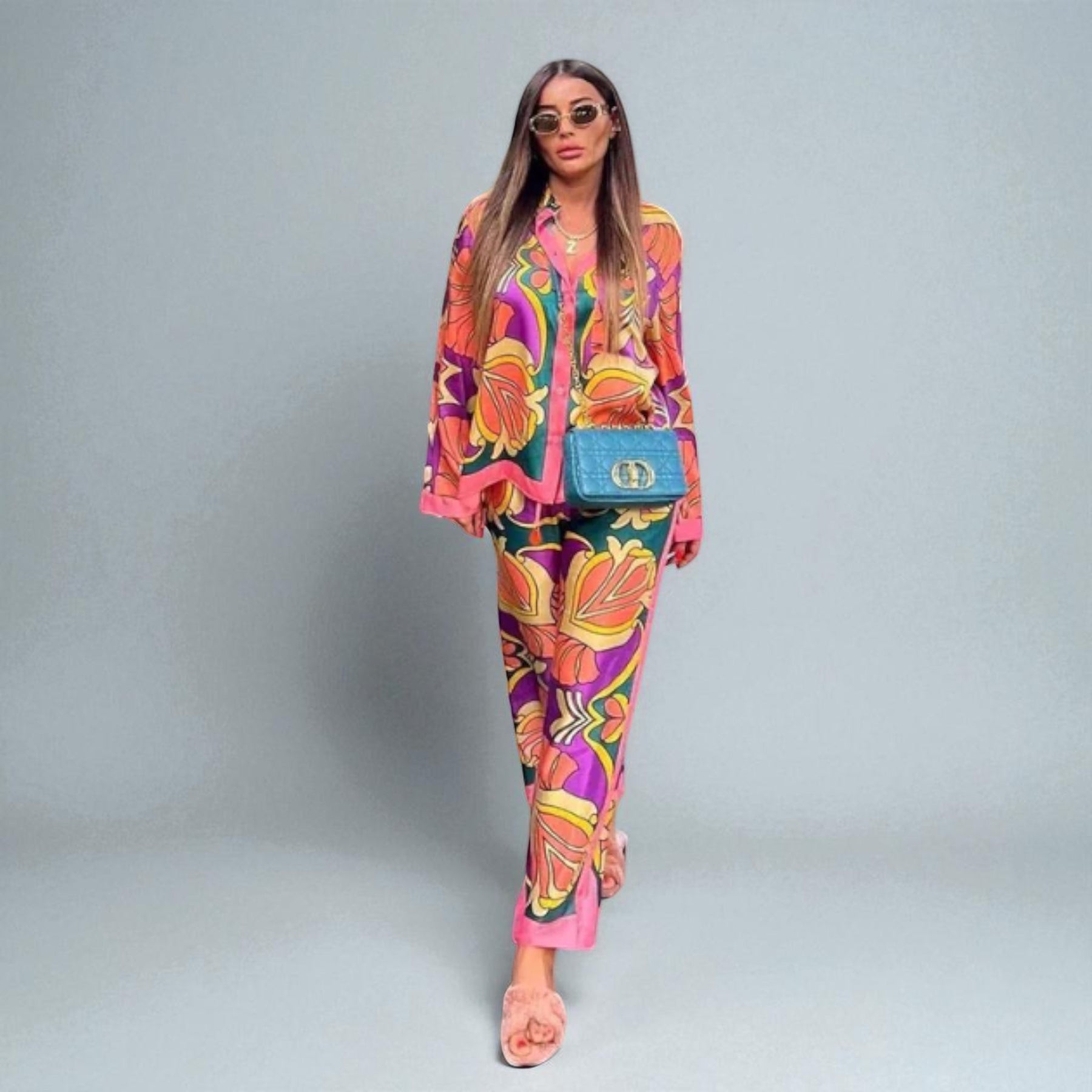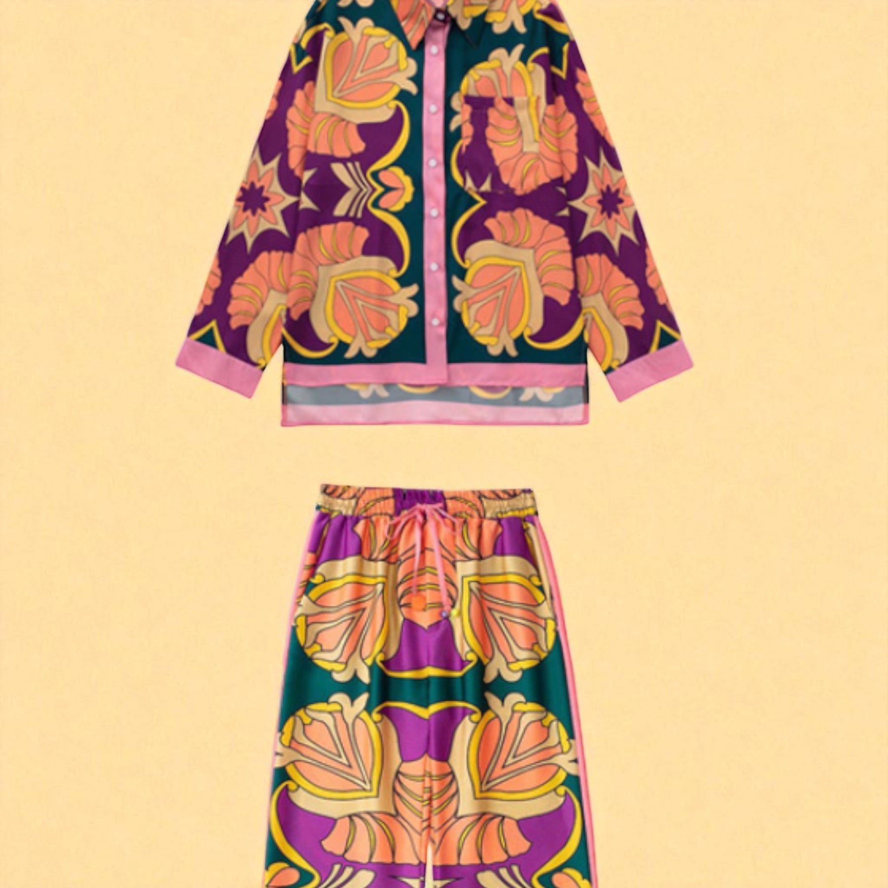 Elegância coordenada em cada detalhe. Design sofisticado de duas peças com camisa estampada e calças coordenadas que combinam versatilidade e modernidade.